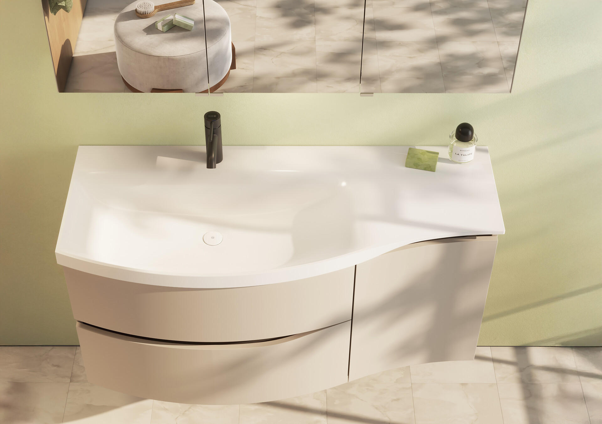 Das Design von Sinea 3.0 wirkt harmonisch und gro.zügig. Durch sein asymmetrisch tiefenreduziertes Layout lässt sich das Waschtisch-Ensemble aber auch raumsparend in kleinen Bädern und engen Raumsituationen einsetzen. Sinea 3.0 schafft dabei mit einer einheitlichen Waschtischkombinationshöhe von 540 mm reichlich Stauraum und lässt gleichzeitig komfortablen Bewegungsfreiraum ohne störende Ecken und Kanten: weich geschwungen, nahbar, einladend.